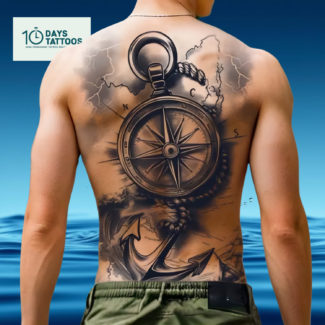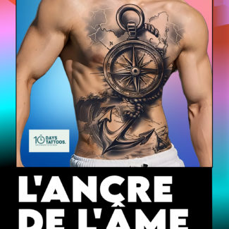 Le tatouage semi-permanent «L’ancre de l’âme» est un chef-d’œuvre en style réaliste organique, représentant un ancre imposante entourée de vagues dynamiques. Conçu pour le dos entier ou la poitrine, ce design spectaculaire exprime la force, la stabilité et la liberté des océans.