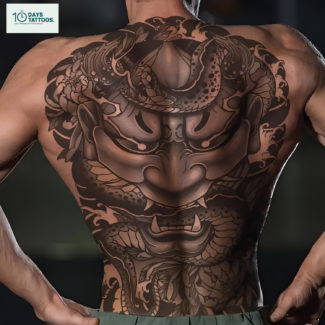 Le tatouage semi-permanent « Gardien Japonais » s’inspire des motifs traditionnels japonais tels que la masque Oni et le dragon, symboles de courage, de protection et de sagesse. Ce design magistral en style Irezumi, idéal pour le dos, mêle richesses culturelles et détails minutieux, invitant à la réflexion et à la force intérieure.